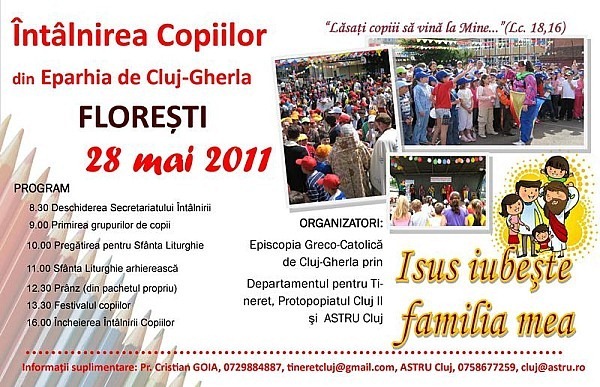 În Eparhia de Cluj-Gherla a devenit o tradiţie ca în ultima sâmbătă din luna mai să celebrăm Întâlnirea Copiilor. Evenimentul este organizat de Departamentul pentru Tineret în colaborare cu Asociaţia Tineretului Român Unit – ASTRU Cluj, preoţii, persoanele consacrate şi laicii implicaţi în pastoraţia copiilor. Anul acesta, parohia română unită cu Roma, greco-catolică “Sfântul Nicolae” din localitatea Floreşti va găzdui în data de 28 mai, a V-a ediţie a Întâlnirii Copiilor din Eparhia de Cluj-Gherla. Tema acestei întâlniri, la care vor participa copii, cu vârste cuprinse între 6-13 ani, este Isus iubeşte familia mea!, iar motoul “Lăsaţi copii să vină la mine…”(Lc 18,16)