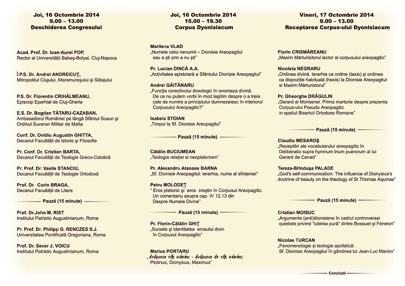 Ciclul de conferinţe, cu tema "Sf. Dionisie Areopagitul. Izvoare, context, receptare", se va desfăşura în Aula Magna, str. M. Kogălniceanu nr. 1 (joi, 16 octombrie, orele 09.00-13.00) şi în Aula "Regele Ferdinand" a Facultăţii de Istorie şi Filosofie, str. Napoca nr. 11 (joi, 16 octombrie, orele 15.00-19.30 şi vineri, 17 octombrie, orele 09.00-13.00).