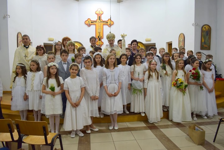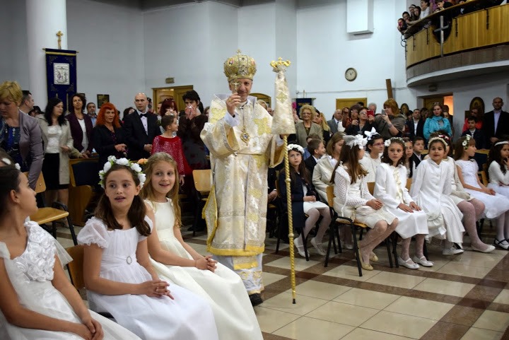 Duminică, 17 mai 2015, a fost o zi de mare bucurie – 48 de copii din şcolile clujene au făcut Prima Sfântă Împărtăşanie. Ei au primit Trupul şi Sângele Domnului din mâna Preasfinţiei Sale Florentin, Episcop de Cluj-Gherla, la Sfânta Liturghie celebrată pentru copii în Capela Sf. Iosif din Piaţa Cipariu, Cluj-Napoca. Pregătirea le-a fost făcută în cadrul Departamentului pentru Cateheză coordonat de pr. consilier Marius Furtună. Sâmbătă, 16 mai 2015, după o examinare a cunoştinţelor de religie, copiii şi-au examinat conştiinţa şi au primit prima dezlegare de păcate prin Spovada la preoţi.
