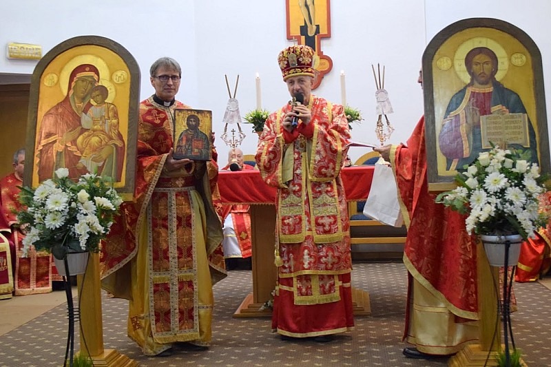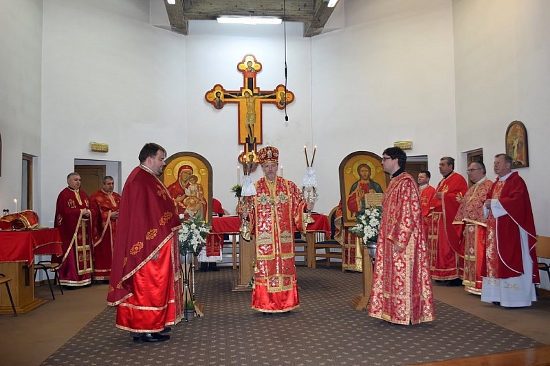 Sfânta Liturghie arhierească a fost celebrată în capela din Piața Cipariu, cu participarea aprox. a 20 de preoți, între care pr. vicar general Călin Bot, preoții protopopi pr. Cristian Sabău și pr. Marius Mureșan, pr. cancelar Cristian David, pr. consilier Adrian Avram, pr. consilier Marius Cerghizan, pr. Marcelin Rotaru celebrantul Liturghiei romano-catolice din duminici și sărbători în această capelă, păstorii acestei parohii și, semne ale continuității din timpul de încercare al Bisericii, preoții: pr. Virgil Florian și pr. Romulus Silaghi, aflați la senectute, dar, la dispoziția credincioșilor zi de zi în Catedrala din Piața Cipariu, cu dăruirea totală de sine ce le e caracteristică. Programul a început de fapt de dimineață, la ora 8.30, cu un Oficiu de mulțumire animat de Grupul de rugăciune "Copiii Sf. Iosif" și a continuat cu Sfânta Liturghie arhierească, după întâmpinarea Ierarhului și intrarea în procesiune a celebranților.