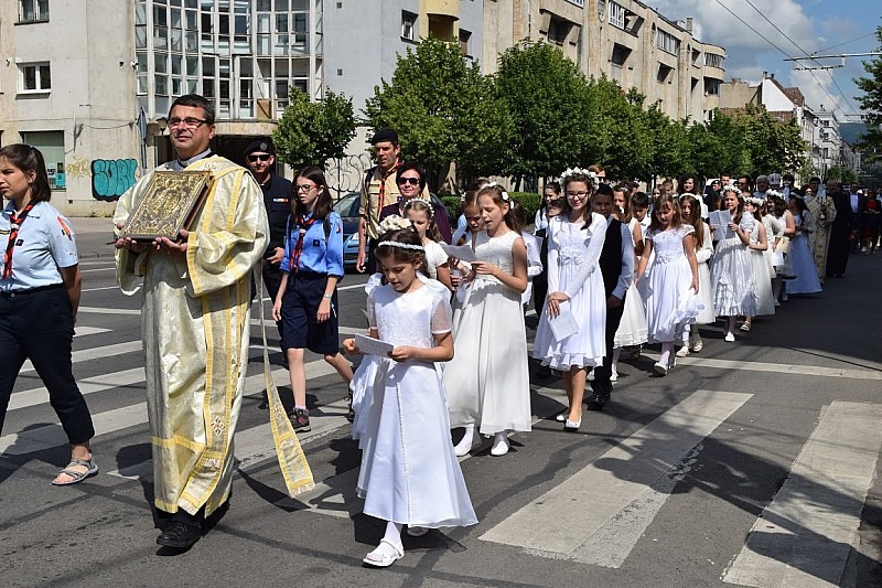 Celebrarea a fost precedată, la fel ca în fiecare an, de o procesiune a copiilor, urmați de Ierarh și preoți, familii, credincioși, care au mers de la Catedrala Schimbarea la Față până la Catedrala în construcție din Piața Cipariu. Ei au trecut prin oraș cântând bucuria întâlnirii cu Dumnezeu, sub razele soarelui dimineții, cu sufletele luminate, dând mărturia credinței curate. Sfânta Liturghie a fost însoțită, prin răspunsuri și cântări, de vocile limpezi ale copiilor corului "Allegria", condus de Cristina Patrașcu-Nagy. La momentul rânduit, cei 32 de copii au făcut, în fața Ierarhului, a preoților și a comunității, profesiunea de credință, au rostit solemn Simbolul credinței și l-au primit pe Isus sub forma pâinii și a vinului.