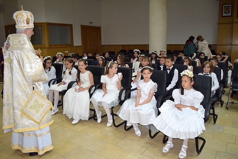 A urmat un dialog pe care Preasfinția Sa l-a avut cu copiii; ei au răspuns, în cor, că au venit în veșminte albe, de sărbătoare, pentru Prima Sfântă Împărtășanie. Au spus și că s-au pregătit pentru acest moment, prin cateheză și Spovadă. La întrebarea: "Ce înseamnă Prima Sfântă Împărtășanie?", au răspuns că îl primesc pe Cristos, Trupul și Sângele Său. "Trebuie să fiți sfinți", le-a spus Ierarhul, "pentru că primindu-l pe Cristos în sufletul vostru, voi veți fi lumina lumii, asemenea lui Isus care a spus ‘Eu sunt Lumina lumii!’"