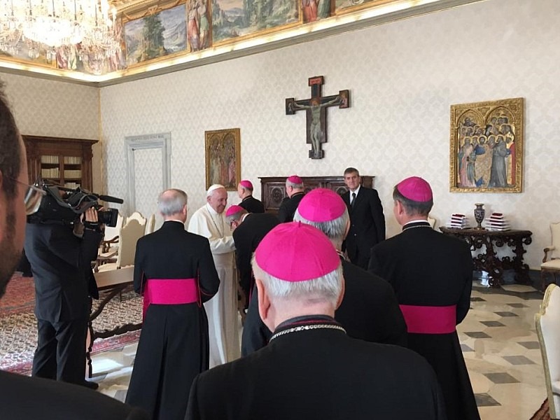 În câteva minute s-au încheiat saluturile și Sfântul Părinte a invitat întreg personalul să iasă din biblioteca apostolică, inclusiv gărzile, fotografii și cameramanul. Am rămas doar noi, Episcopii și Sfântul Părinte, care a luat cuvântul, ne-a urat «bun venit!» și a adăugat: «Am renunțat la audiențele private pentru că am dorit să fim împreună și vom avea acest moment de discuție în care vă rog să vă simțiți total liberi, să îmi spuneți tot ce aveți de spus, tot ce doriți să mă întrebați.» Ne-am bucurat de deschiderea sinceră pe care Sfântul Părinte a arătat-o față de noi. După acest moment, Episcopii au luat, pe rând, cuvântul, începând cu Vicepreședintele Conferinței Episcopale, Arhiepiscopul Ioan Robu, Mitropolitul de București. Fiecare dintre Episcopi a încercat să expună propriile probleme.