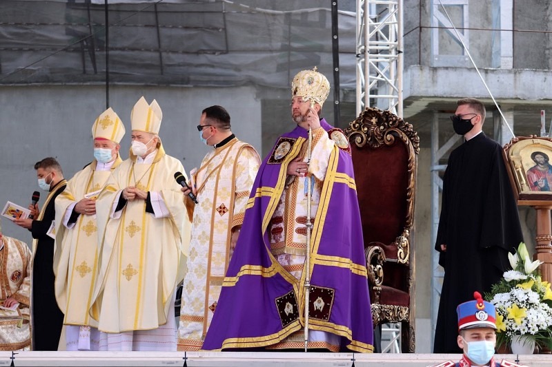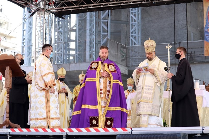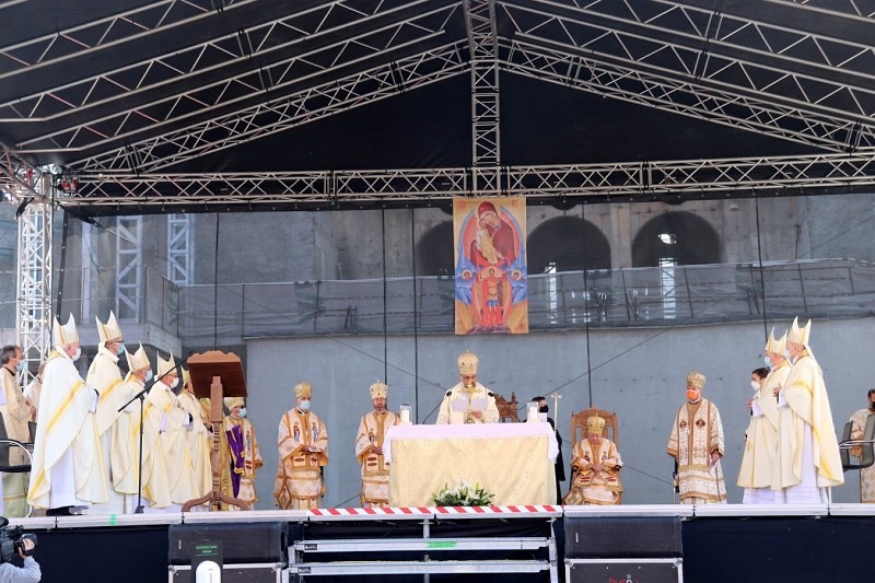 În debutul celebrării, Episcopii catolici și greco-catolici din România și Înalți prelați oaspeți sosiți de peste hotare, au ieșit, în procesiune, după un moment de pregătire în capela „Sf. Iosif” din incinta Catedralei. Ierarhii au urcat pe esplanada unde, încă din după-amiaza precedentă, s-a amenajat altarul pentru celebrarea solemnă. Respectând normele impuse de pandemie, preoți de pe întreg teritoriul Eparhiei de Cluj-Gherla și din întreaga Biserică Română Unită se aflau, în ordine, pe un platou lateral, în timp ce în partea diametral opusă se aflau persoane consacrate din diferite ordine și congregații călugărești.