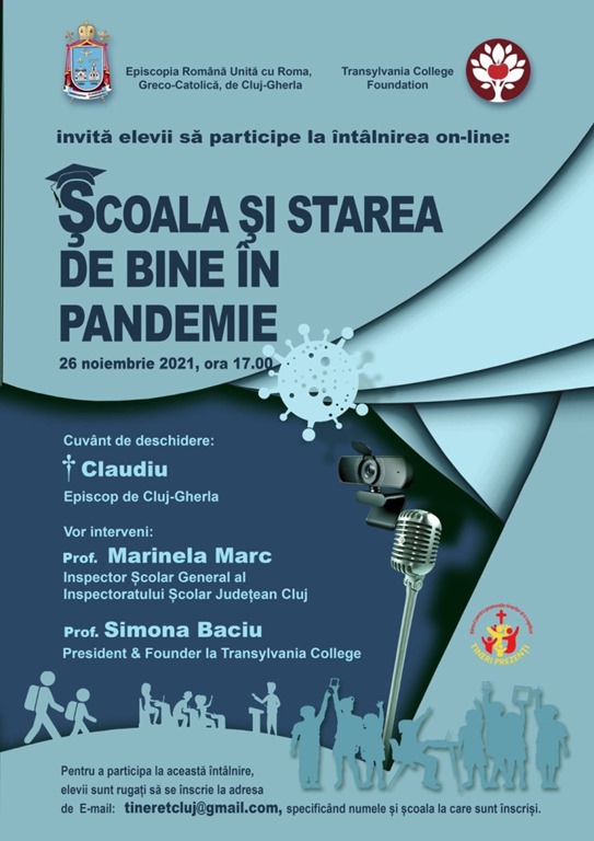 Episcopia Română Unită cu Roma, Greco-Catolică, de Cluj-Gherla, prin Biroul pentru pastorația tinerilor și a copiilor, în colaborare cu Transylvania College Foundation, invită elevii să participe la întâlnirea on-line: Școala și starea de bine în pandemie, vineri, 26 noiembrie 2021, ora 17.00. Invitată la acest Webinar va fi doamna profesor Simona Baciu, President & Founder la Transylvania College, Fondator „Profesori fericiți pentru România”, Președinte la C-EDU Clusterul de Educație Cluj, Membru fondator la Rethink România, Autor „The Teacher Within a mindful journey towards Well-being”. Alături de doamna Simona Baciu va interveni și doamna profesor Marinela Marc, Inspector Școlar General al Inspectoratului Școlar Județean Cluj. Invitatele noastre ne vor vorbi despre provocările pe care le resimt elevii în această perioadă și cum pot face față acestora, precum și despre starea de sănătate emoțională și welbeing (starea de bine).