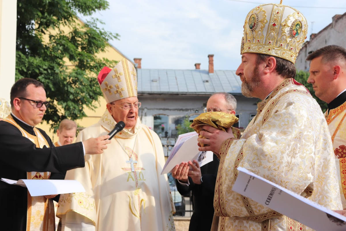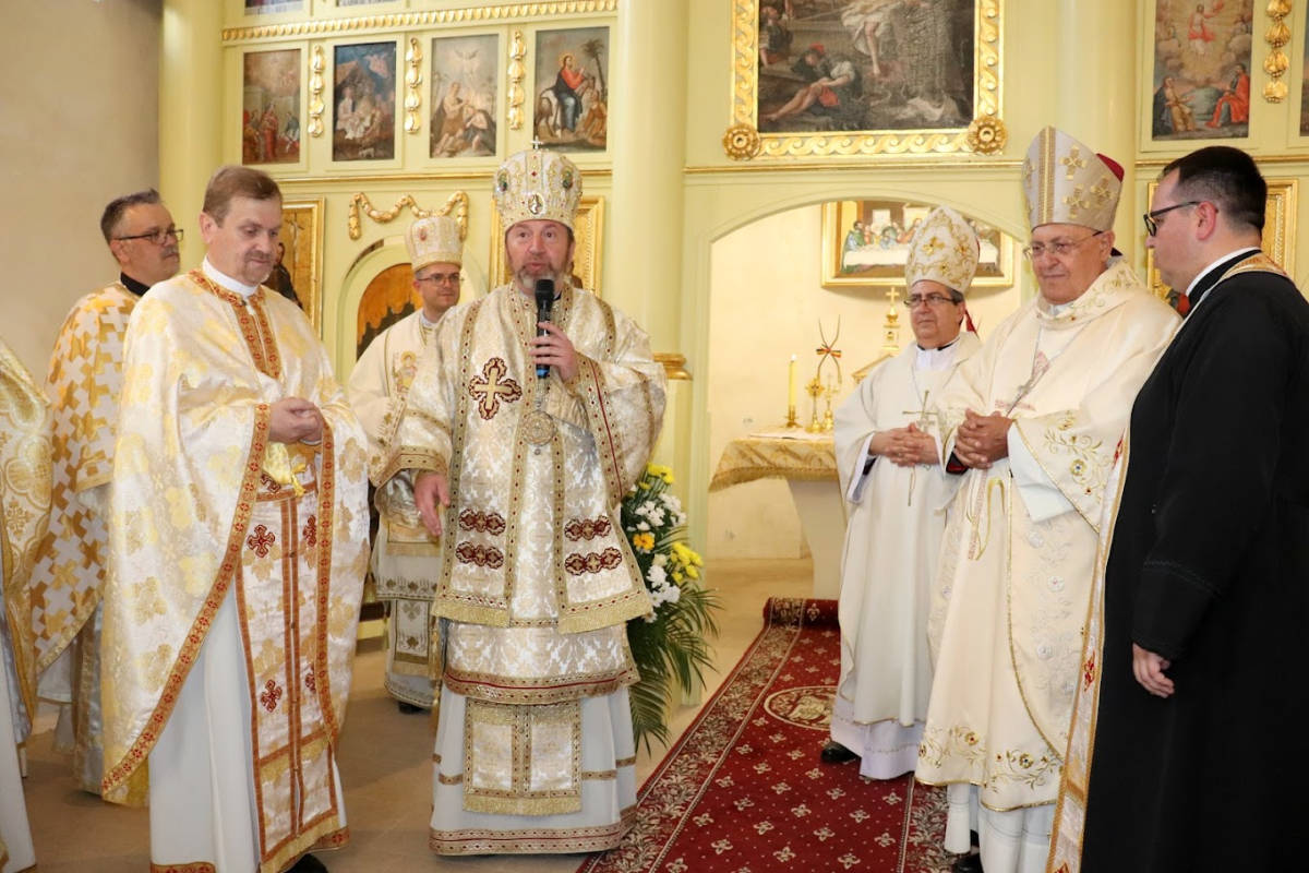 „Cu mare bucurie, vă salut în numele Papei Francisc pe voi toți și vă doresc ca această biserică reînnoită și această sfințirea a altarului să fie semnul participării voastre vii la viața Bisericii. Chiar dacă avem edificii frumoase și biserici frumoase, fără poporul lui Dumnezeu, fără voi, frați și surori, fără familiile voastre, vârstnicii voștri, tinerii voștri, copiii voștri, toate sunt pură aparență. Să fie această ceremonie pentru noi toți și pentru voi toți angajamentul de a participa activ la viața comunității voastre eparhiale și parohiale, călăuziți de Episcopul vostru și de preoții voștri. Aveți un hram care «rupe» toate barierele și toate obstacolele: Cristos Înviat, care aduce tuturor bucurie, seninătate, și în Ucraina, și în toată lumea, pace. Vă mulțumesc tuturor!”