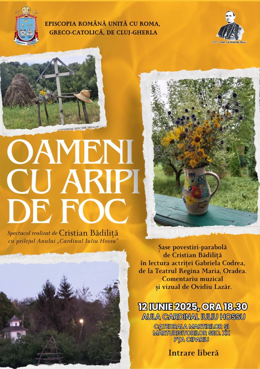 Episcopia Română Unită cu Roma, Greco-Catolică, de Cluj-Gherla organizează miercuri, 12 iunie 2025, începând cu ora 18:30, în Aula „Cardinal Iuliu Hossu” (Catedrala Martirilor și Mărturisitorilor sec. XX, Piața Cipariu – Cluj-Napoca), spectacolul „Oameni cu aripi de foc”, realizat de scriitorul și teologul Cristian Bădiliță, cu prilejul Anului național „Cardinal Iuliu Hossu”.