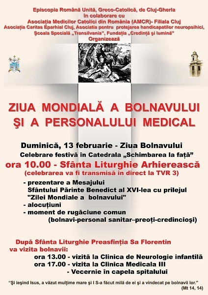 Asociaţia Medicilor Catolici din România (AMCR) - Filiala Cluj, în colaborare cu Episcopia Română Unită, Greco-Catolică, de Cluj-Gherla vor celebra "Ziua Mondiale a Bolnavului şi a personalului sanitar", zi internaţională [...]