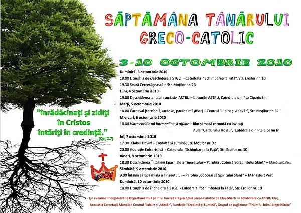 În perioada 3-10 octombrie 2010, în Eparhia Greco-Catolică de Cluj-Gherla se va desfăşuara cea de-a VII-a ediţie a Săptămânii Tânărului Greco-Catolic. Iniţiativa organizării acestui eveniment aparţine Departamentului pentru Tineret al [...]