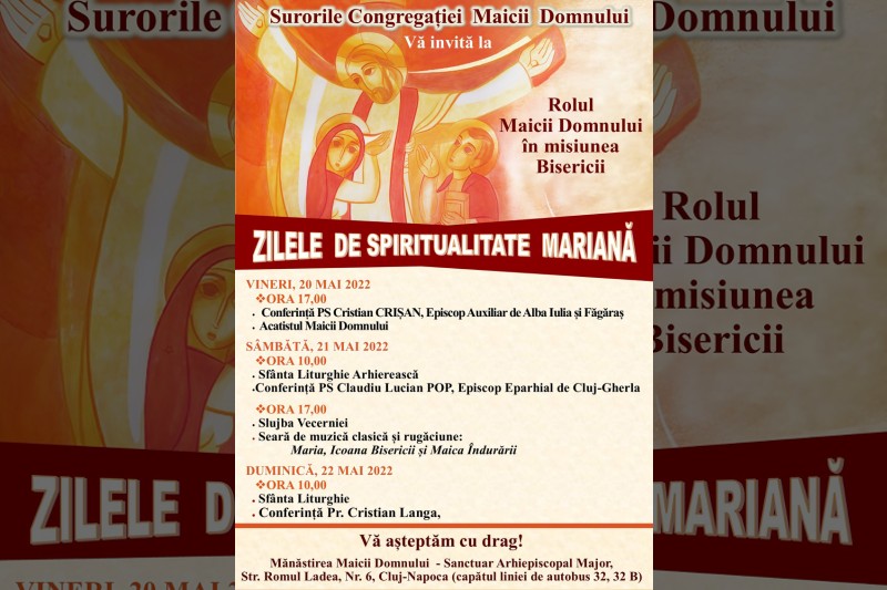 „Rolul Maicii Domnului în misiunea Bisericii” relevat în cadrul Zilelor de Spiritualitate Mariană la Mănăstirea Maicii Domnului din Cluj-Napoca Surorile Congregației Maicii Domnului (CMD) invită credincioșii cinstitori ai Preasfintei [...]