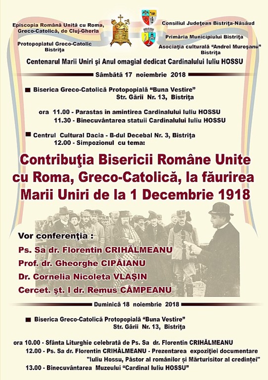 Episcopia Română Unită cu Roma, Greco-Catolică, de Cluj-Gherla și Protopopiatul Greco-Catolic Bistrița, în colaborare cu Consiliul Județean Bistrița-Năsăud, Primăria Municipiului Bistrița și Asociația culturală "Andrei Mureșanu" - Bistrița, organizează, - [...]