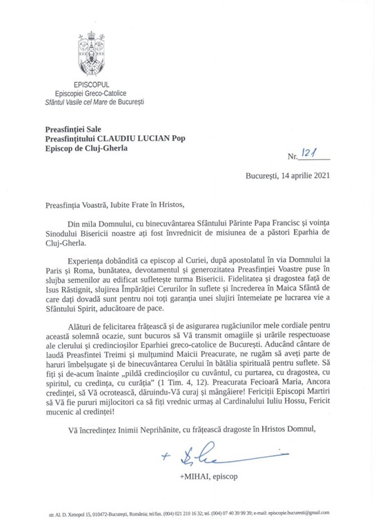Preasfinția Voastră, Confirmarea Papei Francisc a alegerii Preasfinției Voastre de către Sinodul Bisericii noastre, în scaunul Eparhiei de Cluj-Gherla, Vă conferă darul slujirii episcopale și demnitatea însoțirii preoților și credincioșilor [...]